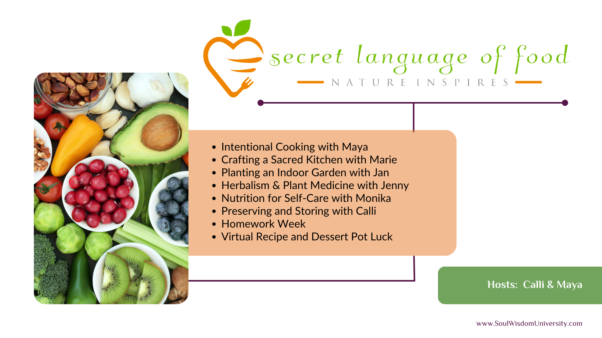 Online eight-week free course that provides the knowledge you need to know and provides the hands-on experience so that you can create your own wisdom in the secret language of food!